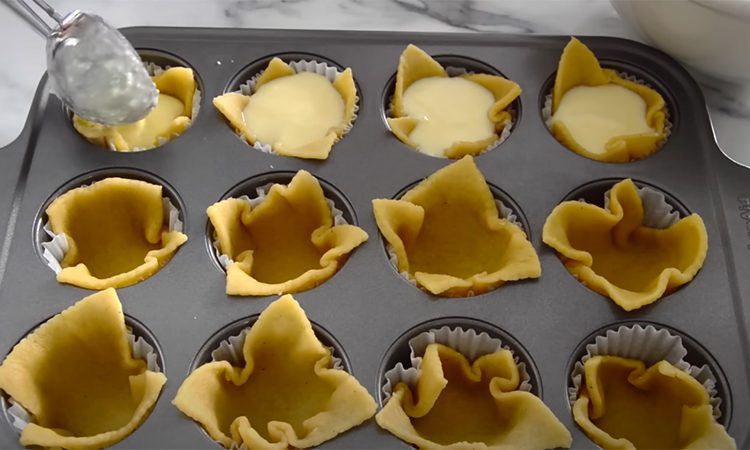 4. Выложите каждый квадрат в формочку для капкейков, аккуратно загибая уголки теста наружу, чтобы образовалась своего рода «корзиночка». В центр каждой корзиночки положите по 1–2 столовые ложки творожной начинки, распределяя равномерно, но не доходя до краев, чтобы тесто можно было красиво завернуть.