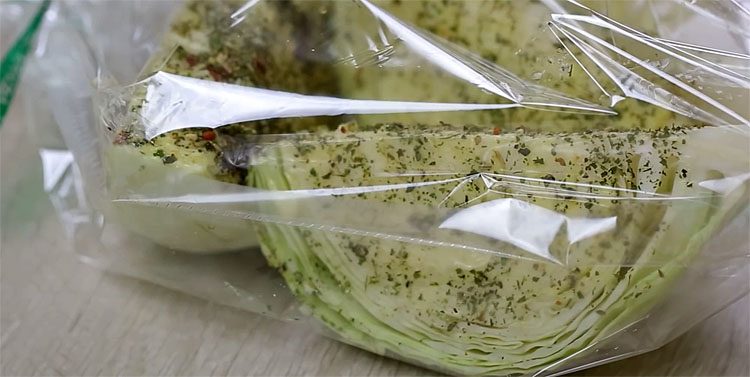 3. Берём рукав для запекания и помещаем туда подготовленные сегменты капусты. Убедитесь, что между листьями есть немного пространства, чтобы горячий воздух мог проникать внутрь и пропекать капусту равномерно. Завязываем пакет с обеих сторон, при необходимости слегка прокалываем сверху пару маленьких отверстий, чтобы пар выходил, но капуста оставалась сочной.