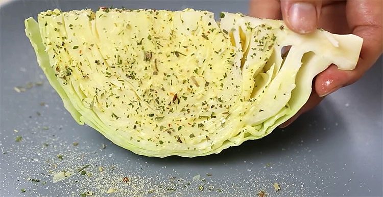 2. Размягчённое сливочное масло наносим кисточкой или руками на каждый сегмент капусты. Особое внимание уделяем внутренним листьям — масло должно проникнуть между ними. Это обеспечит сочность и насыщенный вкус. Затем аккуратно солим капусту, присыпаем смесью итальянских трав и сухого чеснока, слегка растирая специи, чтобы они лучше прилипли. Можно добавить немного черного перца по вкусу для лёгкой пикантности.