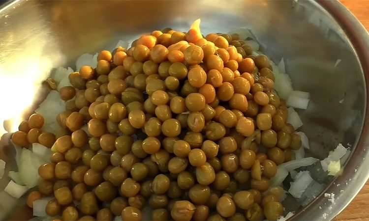 Нарежьте две крупные луковицы мелким кубиком для равномерного распределения в тесте. С зеленого горошка тщательно слейте всю лишнюю жидкость и переложите его в глубокую миску, стараясь не раздавить целые зерна. К горошку добавьте нарезанный лук, вбейте два яйца и хорошо перемешайте массу.