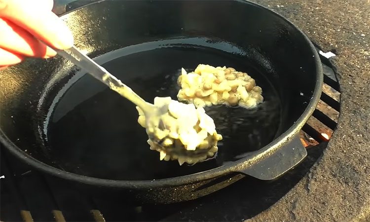 Посолите и обильно приправьте смесь черным молотым перцем, ориентируясь на свои вкусовые предпочтения. Начинайте постепенно подсыпать пшеничную муку, перемешивая после каждой ложки, пока масса не станет клейкой и густой. Разогрейте сковороду с достаточным количеством растительного масла, так как овощи активно впитывают жир при жарке.