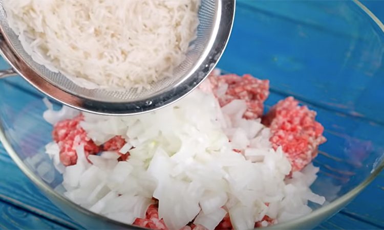 1. В глубокую миску выложите говяжий фарш. Добавьте соль, перец, сухой рис, очень мелко нарезанный лук и мелко порубленную квашеную капусту. Перемешивайте массу руками или ложкой несколько минут, чтобы ингредиенты распределились равномерно и фарш стал более вязким — тогда начинка будет держать форму и останется сочной.