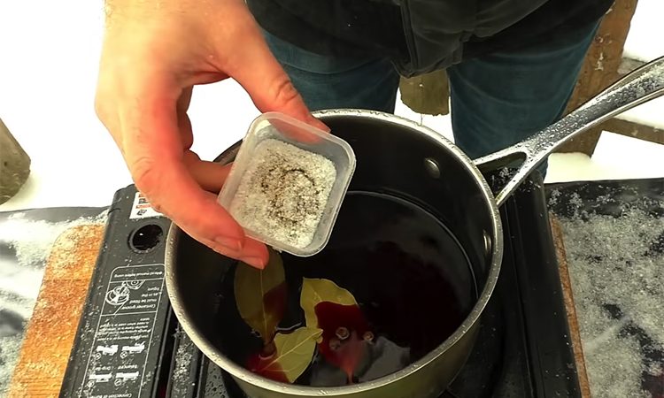 Подготовьте пряную основу, влив в сотейник пол-литра красного сухого вина и добавив лавровый лист, душистый и черный перец. Всыпьте острый красный перец, специальную приправу для сала, кориандр, соль и очищенные зубчики чеснока. Доведите смесь до кипения и варите на медленном огне ровно три минуты без крышки, чтобы спирт выпарился и маринад стал более концентрированным.