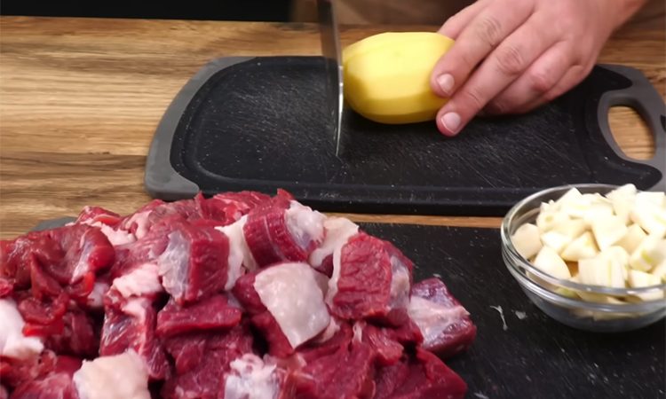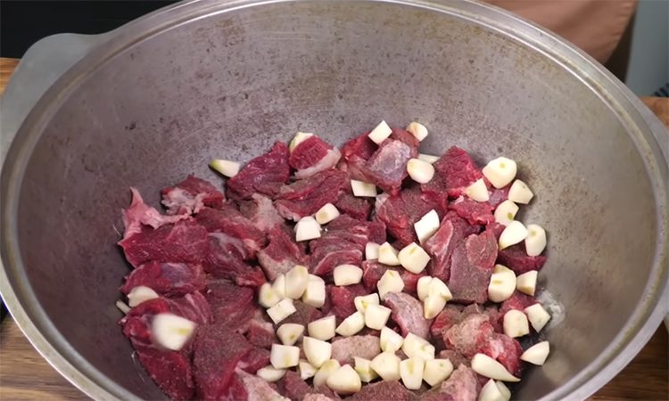 Очистите картофель, тщательно промойте его и нарежьте крупным кубиком с гранью примерно 3–5 см, чтобы он не разварился при длительном томлении. Нарежьте говядину такими же по размеру кубиками, удалите только самые крупные и жесткие жилы, оставляя мелкие прожилки для сочности. Очистите чеснок, крупные зубчики разрежьте пополам, чтобы кусочки были примерно одинаковыми. Возьмите казан или кастрюлю с толстым дном и начните формировать слои.