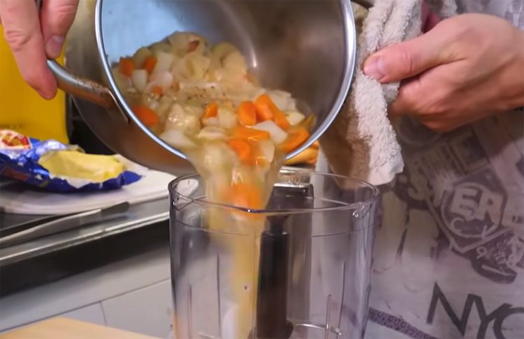 4. Готовые овощи переложите в куттер и измельчите до однородной массы, затем верните пюре обратно в кастрюлю и поставьте на огонь. Добавьте сливки, доведите суп до кипения и сразу положите плавленый сыр. После этого выключите огонь, накройте кастрюлю крышкой и дайте супу настояться 3–5 минут, чтобы сыр полностью растворился, а вкус стал гармоничным.