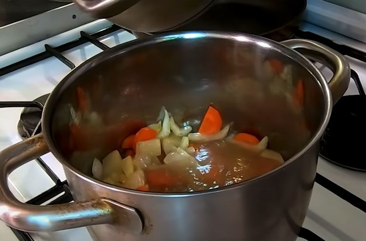3. Влейте бульон так, чтобы он полностью покрывал овощи. Добавьте соль, перец и специи по вкусу — отлично подойдут паприка или сушеный чеснок. Варите на среднем огне до готовности, пока картофель не станет почти мягким.
