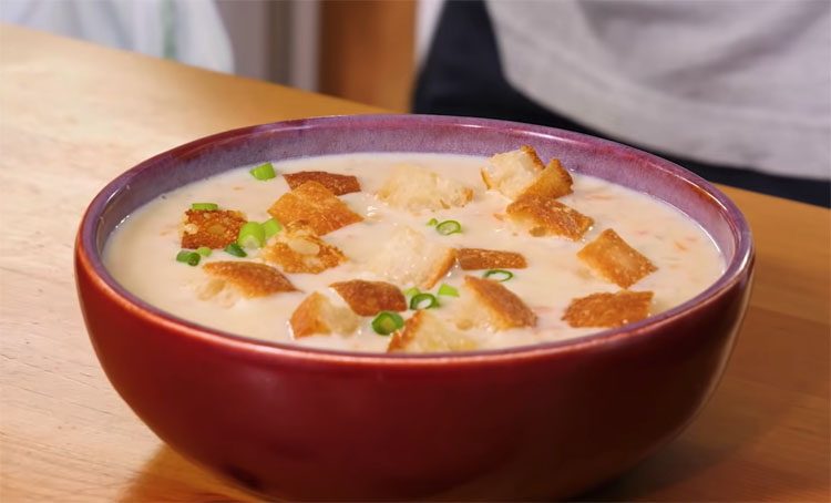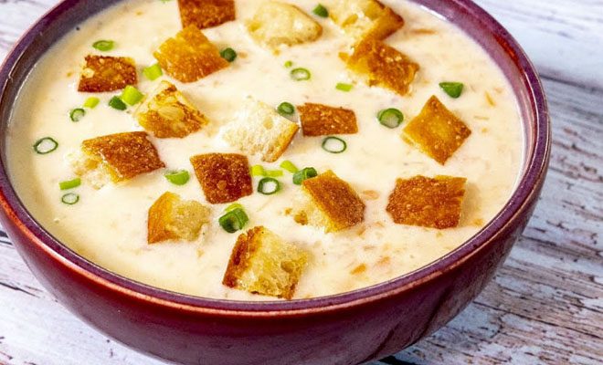 5. Подавайте сырный суп горячим, с чесночными гренками, свежим хлебом или тостами. Гренки можно приготовить заранее, слегка подсушив хлеб в духовке и натерев его чесноком. Такой суп понравится всем — и детям, и взрослым.