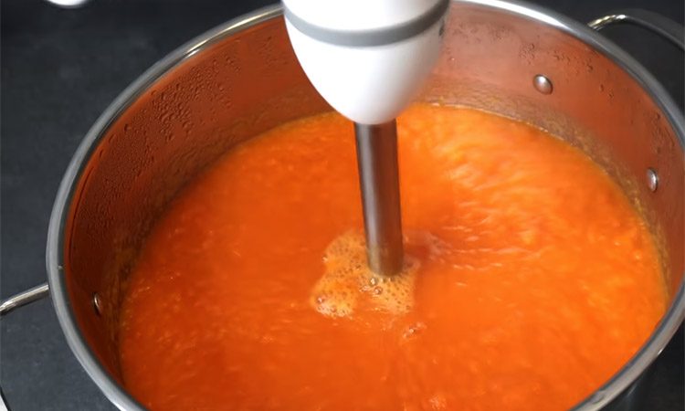 Поставьте кастрюлю на плиту, доведите содержимое до кипения и варите на медленном огне примерно сорок минут до полной мягкости моркови. Снимите кастрюлю с огня и тщательно пробейте массу погружным блендером до состояния абсолютно гладкого пюре.