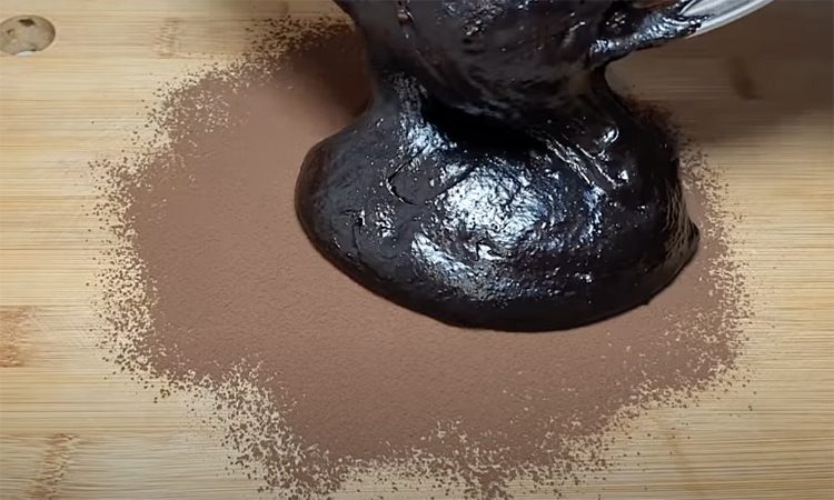4. Присыпьте стол или доску небольшим количеством какао-порошка. Это предотвратит прилипание шоколадной массы. Аккуратно вылейте на поверхность шоколадную массу и слегка обваляйте её в какао, чтобы образовалась тонкая сухая корочка снаружи.