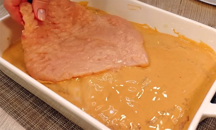 Куриные отбивные лучше всего готовить большими: так мясо не теряет сочности и получается нежнее обычного. Длительное маринование в специальной смеси на основе сметаны и горчицы размягчит волокна — тот же маринад послужит одновременно и кляром, который запечатает внутри все соки. Мясо получится невероятно нежным, одной такой отбивной вполне хватит на несколько порций.