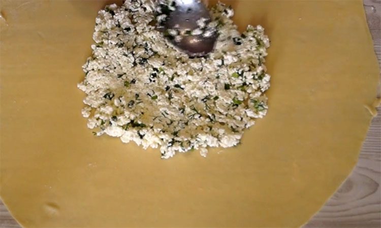 Сформируйте из него жгут, разделите на семь равных частей (примерно по 150 г каждая), скатайте в шарики и уберите в холодильник минимум на один час, обернув пищевой пленкой. Подготовьте начинку: смешайте творог с двумя яйцами, солью и мелко порубленной зеленью лука и укропа до однородного состояния. Достаньте кусочек теста из холодильника и раскатайте его в очень тонкий круг диаметром около 35 см, чтобы он буквально просвечивал.