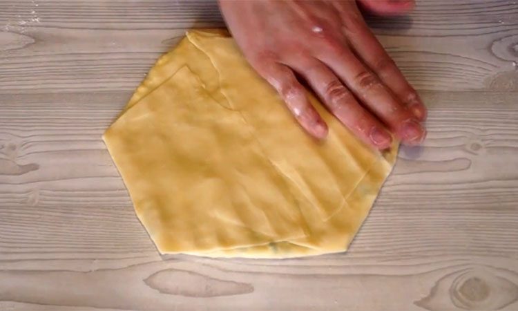 Поочередно загибайте противоположные сегменты к центру, накрывая ими творог.