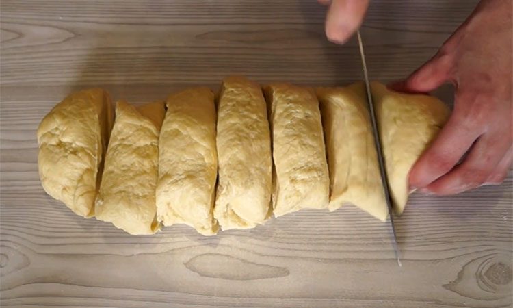 Выложите в центр три ложки начинки и разровняйте её, оставляя края свободными. Сделайте ножом надрезы от краев к начинке, деля свободное тесто на шесть сегментов («лепестков»).