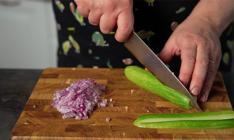 Затем мелко нарежьте красный лук. Если хотите, чтобы вкус был менее резким, лука можно положить совсем немного. Свежий огурец очистите от сердцевины с семенами (чтобы намазка не «потекла») и нарежьте мелким кубиком, чуть крупнее лука. Мелко порубите зелень и отправьте в общую миску. Теперь намазку нужно заправить: добавьте несколько щепоток черного перца, соль и лимонный сок.