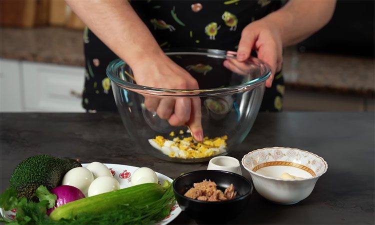 Подготовьте основу. Вареные яйца не обязательно резать ножом — их можно просто размять вилкой или воспользоваться толкушкой для картофеля, чтобы получить нужную текстуру. Тунец достаньте из банки, слейте лишнюю жидкость и добавьте к яйцам, также разминая вилкой на волокна. Мягкое авокадо очистите и разомните толкушкой прямо в миску к рыбе и яйцам.