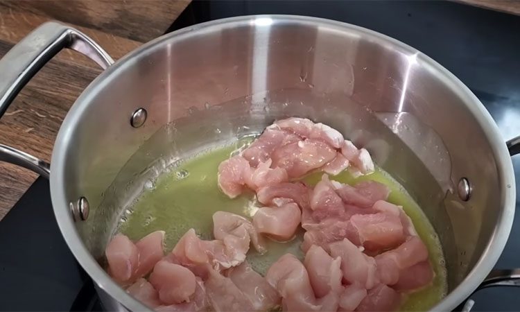 1. Начните с нарезки куриного филе на небольшие кусочки. Это поможет мясу быстрее приготовиться и насытит суп вкусом курицы. В сотейнике растопите сливочное масло и обжаривайте куриное филе на среднем огне около 3 минут. Важно не пережарить мясо, чтобы оно не стало жестким, а сохранило свою нежность.
