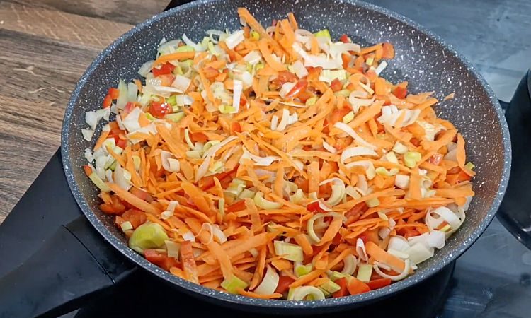4. В это время очистите лук и болгарский перец. Лук нарежьте мелким кубиком, а перец — соломкой. Морковь натрите на терке, чтобы она быстро приготовилась. Обжаривайте эти овощи на сковороде с добавлением оливкового масла. Это придаст им золотистый цвет и карамельный вкус, который прекрасно впишется в общий аромат супа. После того как овощи обжарятся, добавьте их в кастрюлю с супом.