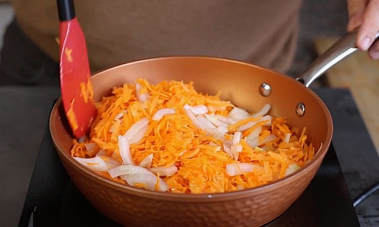 2. В сковороде разогреть 2–3 столовые ложки растительного масла. Добавить нарезанный лук и натертую морковь. Обжаривать на среднем огне около 3 минут, постоянно помешивая, чтобы овощи не пригорели. Через 3 минуты добавить специи и продолжать обжаривать еще 3 минуты, пока смесь не станет ароматной и слегка мягкой, но не пережаренной. Снять сковороду с огня.