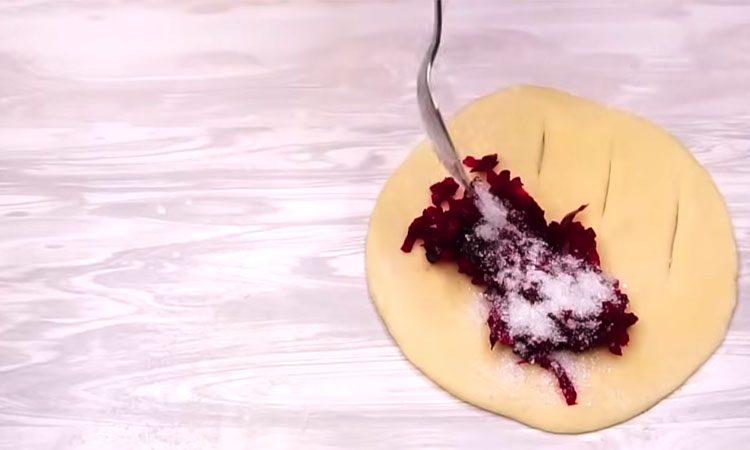 Налейте в глубокую миску теплую минеральную воду, всыпьте сахар, добавьте дрожжи и три столовые ложки муки. Тщательно перемешайте массу венчиком и оставьте её в теплом месте на пятнадцать минут до появления пенной шапки. Добавьте соль, влейте растительное масло и постепенно введите просеянную муку. Замесите мягкое, слегка липкое тесто, накройте его крышкой и уберите в тепло еще на двадцать минут для подъема. Натрите две предварительно отваренные свеклы на крупной терке и обязательно отожмите лишний сок, чтобы начинка не была слишком водянистой.