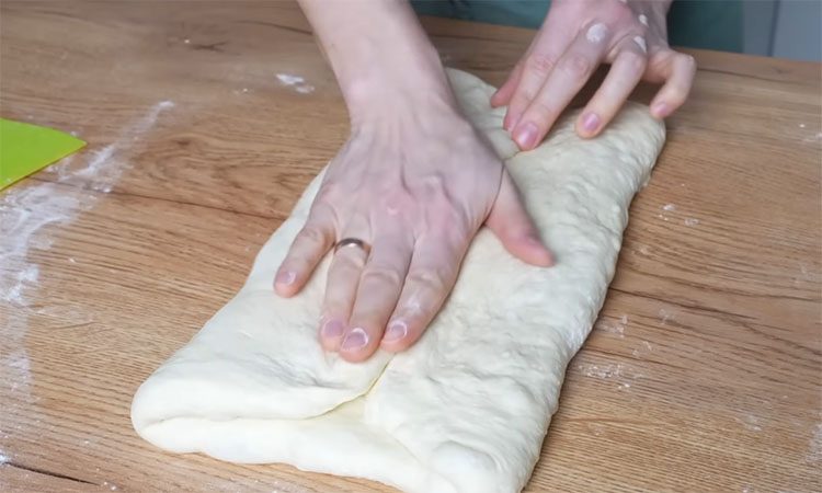 Когда час пройдет, выложите тесто на присыпанный мукой стол и аккуратно растяните его в прямоугольный пласт. Сложите его конвертом, снова накройте миской и дайте отдохнуть еще 20 минут — это поможет развитию клейковины для пышности будущего хлеба.