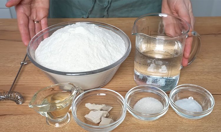 Приготовьте опару. В большой миске смешайте теплую воду с сахаром и дрожжами до полного растворения. Всыпьте примерно 200 граммов муки из общего количества, тщательно перемешайте и оставьте в теплом месте на 10–15 минут, чтобы масса вспенилась и стала пышной. После этого добавьте соль, растительное рафинированное масло и оставшуюся муку. Замесите тесто руками или в планетарном миксере. Оно должно получиться удобным в работе и не слишком липким.