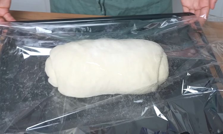 Затем снова растяните тесто в пласт и приступайте к формовке. Сложите края к центру и плотно сверните тесто в рулет, прижимая каждый виток большими пальцами. Хорошо защипните шов и обильно присыпьте заготовку мукой, чтобы она не прилипла к пленке во время выпечки. Поместите хлебную заготовку внутрь рукава для запекания, завяжите один край и оставьте подниматься прямо в нем на 40 минут.