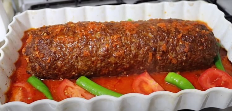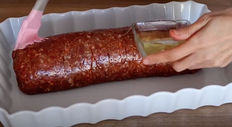6. Достаньте рулет из духовки, равномерно полейте его соусом. При желании разложите по краям формы дольки свежих помидоров или сладкий перец — они пропитаются мясным соком. Верните блюдо в духовку еще на 10 минут, чтобы соус схватился и рулет окончательно приготовился.