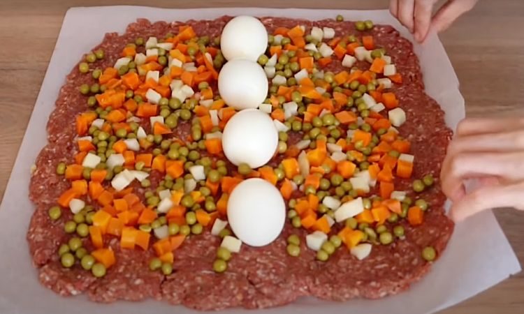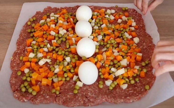 2. Лист пергамента смажьте тонким слоем масла и выложите на него весь фарш. Разровняйте его мокрыми руками или лопаткой в прямоугольный пласт толщиной примерно 1–1,5 см. В центр выложите консервированные овощи, предварительно слив лишнюю жидкость, а сверху — очищенные вареные яйца, располагая их в в центре в линию, чтобы рулет красиво смотрелся в разрезе.