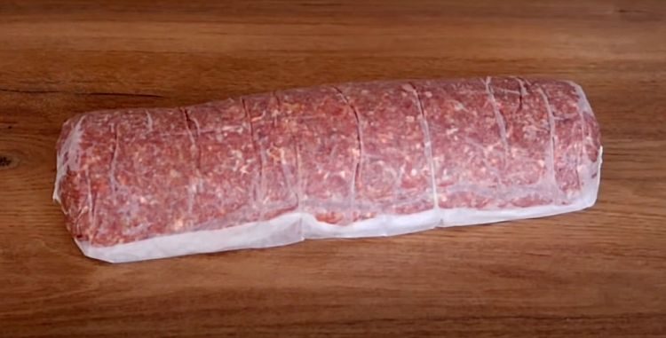 3. Поднимая пергамент с одной стороны, аккуратно сверните фарш в плотный рулет, стараясь не оставлять пустот. Края слегка прижмите, чтобы начинка оказалась внутри. Завернутый рулет вместе с бумагой переложите на доску или противень и уберите в холодильник на 1 час — охлаждение поможет сохранить форму.