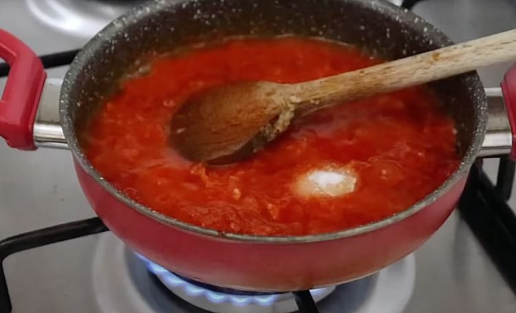 5. Пока мясо запекается, приготовьте соус. В сковороде разогрейте растительное масло, добавьте томатную пасту и прогрейте ее минуту, чтобы вкус стал насыщеннее. Затем выложите тертый помидор и измельченный чеснок, влейте горячую воду, посолите и готовьте на среднем огне примерно 5 минут, периодически помешивая — соус должен слегка загустеть.