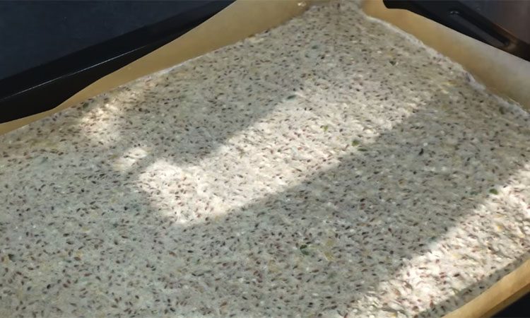 Тесто по консистенции должно напоминать густую сметану. Подготовьте стандартный противень, застелив его бумагой для выпечки. Выложите полученную массу и максимально равномерно распределите её тонким слоем по всей поверхности. Ставьте противень в разогретую до 200 градусов духовку на 10 минут. Этого времени достаточно, чтобы масса «схватилась» и стала плотной.