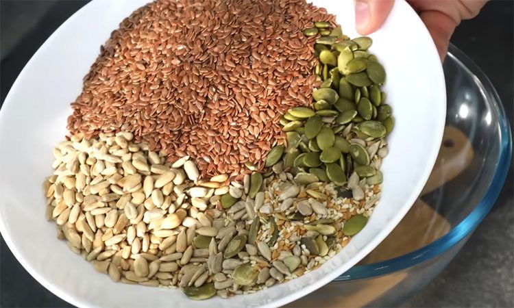 Для начала определитесь с основой из семян. Это может быть смесь подсолнечника, тыквенных семечек, льна и кунжута — общий вес должен составить 250 граммов (примерно один стакан). Высыпьте их в глубокую миску и добавьте любую муку на ваш выбор, например, ржаную. Следом всыпьте соль, влейте растительное масло и начните постепенно добавлять воду. Сначала влейте 300 мл, и если масса покажется слишком густой, добавьте еще около 50 мл.