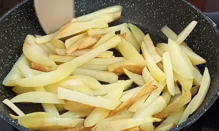 Очистите картофель и нарежьте аккуратными брусочками. Чтобы картошка получилась хрустящей и не слипалась, промойте нарезку в холодной воде, удаляя лишний крахмал, а затем обязательно выложите на полотенце и тщательно обсушите. Разогрейте сковороду с растительным маслом и выложите картофель. Жарьте его на среднем огне, стараясь не перемешивать слишком часто, чтобы кусочки подрумянились и сохранили форму. Когда картофель станет золотистым и будет практически готов, добавьте к нему мелко нарезанный лук.