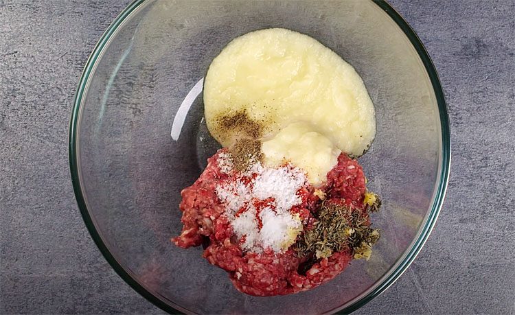 2. В миске смешайте мясной фарш с мелко нарезанным луком и чесноком, можно пробить в блендере. Добавьте тимьян, копченую паприку, перец и приправы для картошки по вкусу. Хорошо перемешайте фарш, чтобы специи равномерно распределились по всей массе.