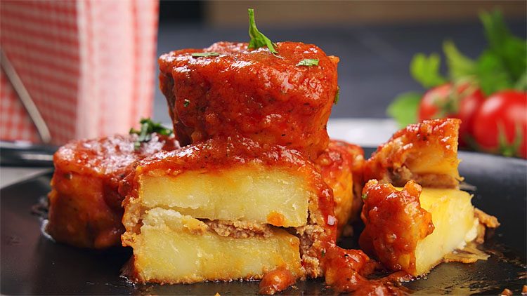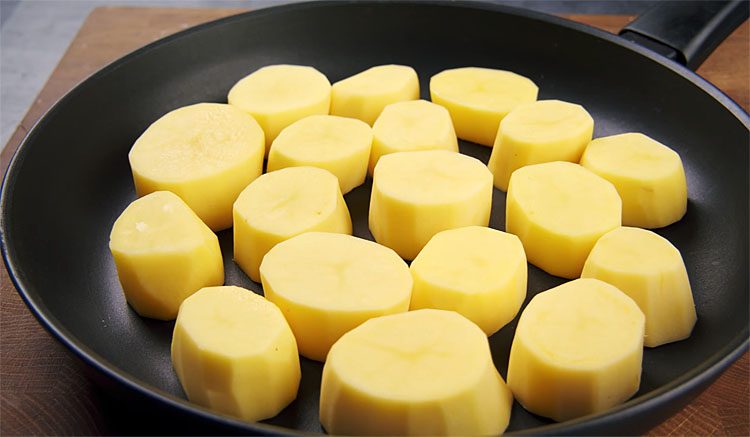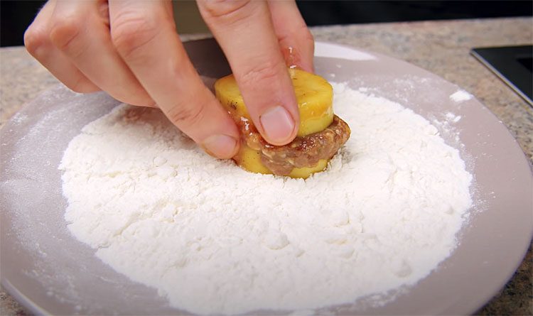 5. Разогрейте сковороду с растительным маслом на среднем огне. Каждый фаршированный ломтик картофеля сначала обмакните в кляр, затем обваляйте в муке. Обжаривайте картошку с обеих сторон до золотистой корочки (по 5 минут с каждой стороны). Важно не перегревать сковороду, чтобы картофель успел прожариться внутри.