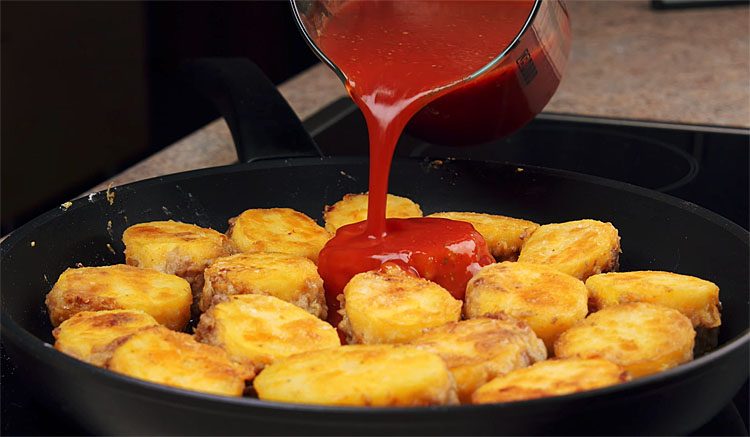 6. Пока картошка жарится, подготовьте томатный соус. В миске смешайте томатный сок (или разведенную томатную пасту с водой) с любыми приправами по вкусу — можно добавить чуть-чуть соли, сахара или дополнительных специй. Переложите обжаренную картошку в кастрюлю или глубокую сковороду с крышкой, залейте томатным соком. Накройте крышкой и тушите на среднем огне около 30 минут, пока картофель не станет мягким и хорошо пропитается соусом.