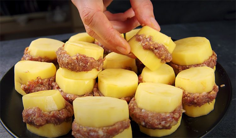 3. Аккуратно начините каждый ломтик картофеля фаршем, заполняя им надрезы. Постарайтесь, чтобы фарш не вываливался и равномерно распределился в каждом ломтике.