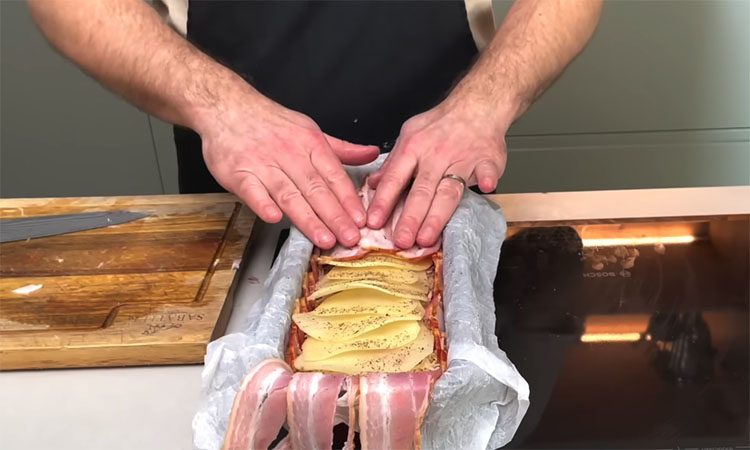 Когда форма будет заполнена, накройте картофель свисающими краями бекона, «запечатывая» его внутри. Сверху можно прикрыть бумагой для запекания, чтобы бекон не подгорел раньше времени. Отправляйте форму в духовку, разогретую до 210 градусов, на 45–50 минут.