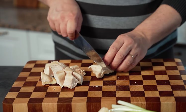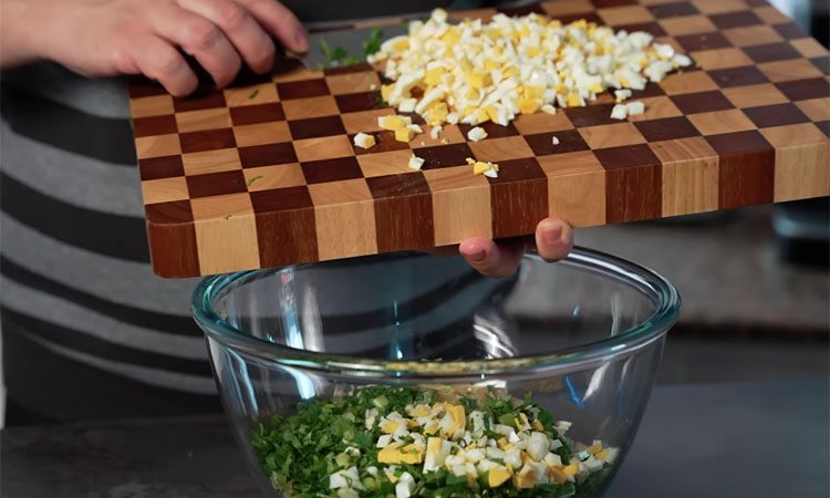 Снимите сковороду с огня и дайте зажарке полностью остыть. Пока лук остывает, займитесь курицей. Отварную грудку (сваренную в простой воде без соли и специй) нарежьте крупными кусками, а затем руками разделите на волокна. Не обязательно добиваться идеальной тонкости, достаточно просто разобрать мясо на небольшие фрагменты. Следом нарежьте сваренные вкрутую яйца средним кубиком и мелко порубите всю зелень: зеленый лук и кинзу. В глубокой миске соедините подготовленную курицу, нарезанные яйца, остывший жареный лук вместе с чесноком и консервированную кукурузу.