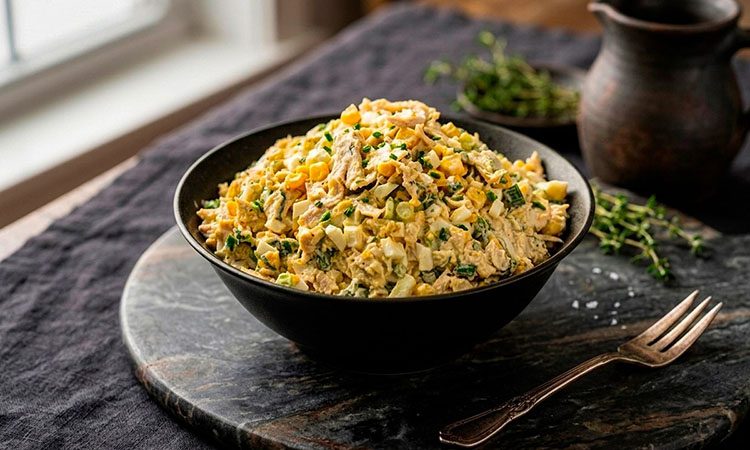 Приготовление идеального салата часто требует не дорогих деликатесов, а одного точного кулинарного приема, станет главным акцентом всего блюда. В рецепте простого куриного салата таким секретом станет обжаренный до карамелизации лук с чесноком. Именно он превратит классическое сочетание курицы и яиц в нечто совершенно особенное. Салат получается очень сытным, с глубоким ароматом и приятной текстурой, где сладость кукурузы встречается с пикантностью жареных овощей и свежестью зелени.