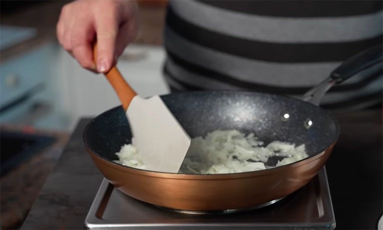 Первым делом подготовьте лук и чеснок, так как им нужно время остыть. Нарежьте лук средними кусочками, чтобы он отчетливо ощущался в салате. Разогрейте сковороду с небольшим количеством масла и обжаривайте лук на высокой температуре, постоянно помешивая, пока он не начнет карамелизоваться и приобретать золотистый цвет. В этот момент добавьте к луку измельченный чеснок и прижаривайте их вместе еще 2–3 минуты, внимательно следя, чтобы чеснок не подгорел.