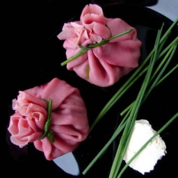 Оригинальный рецепт — Блинные мешочки с жюльеном из красной рыбы. С начинкой — они становятся сытнее и могут служить в качестве закуски на праздничном или фуршетном столе.