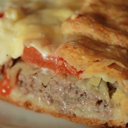 Изюминка этого открытого пирога с мясом — картофельное тесто, нежное и хрустящее, оно превосходно держит форму. Благодаря обилию сочной и ароматной начинки, блюдо получается необычайно сытным.