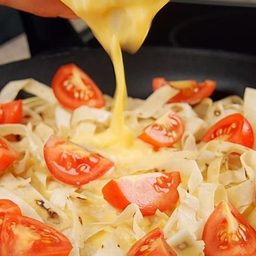 Тонкий армянский лаваш можно использовать не только вместо хлеба. Нарежьте его ножницами на тонкие полоски, и у вас быстро получится отличная альтернатива макаронам. Их не нужно варить, поэтому приготовим на сковороде. Добавим яйца и помидоры, и ужин будет готов всего за 5 минут.