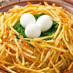 Новогодняя версия салата «Гнездо Глухаря» позволяет сразу подать гостю аккуратную, готовую индивидуальную порцию с хрустящей основой из картофеля пай и мягкой начинкой. Картофельная корзинка служит не только украшением, но и полноценной частью вкуса, поддерживая сам салат с курицей и огурцом. Перепелиные яйца в центре визуально собирают композицию и подчеркивают тему гнезда. Нежный салат легко вписывается и в новогоднее меню, и в любое застолье, где важна яркая подача. ...