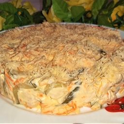 Вкуснейший слоеный салат с куриным филе и грибами. Отлично смотрится на праздничном столе, гости от него в восторге!