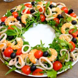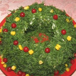 Сегодня, на кануне праздника Рождества Христова, предлагаю вам приготовить вкусный салат с куриной грудкой, сыром и яйцами и оформить его в виде веночка, которым принято украшать двери домов.