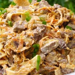 Этот салат стал для меня приятным открытием. Очень рекомендую его приготовить и Вам! Рецепт этого салата был записан у меня давно, но я все оттягивала его приготовление и теперь жалею об этом. Салат получается нереально вкусным, уверена, что он понравится всем, но больше всего любителям китайской кухни, есть в нем некая изюминка и намек на китайскую кухню) ...