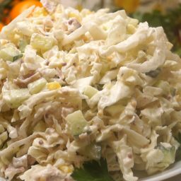 Этот сочный, сытный салатик прекрасно подойдет как к праздничному столу, так и на самый обычный ужин. Готовится быстро, на его подготовку у вас уйдет не больше десяти минут.