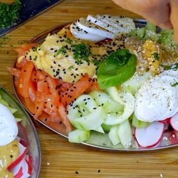 Делаем очень вкусный салат из томатов, огурца и редиски, с замечательным дрессингом из манго, авокадо и горчицы.